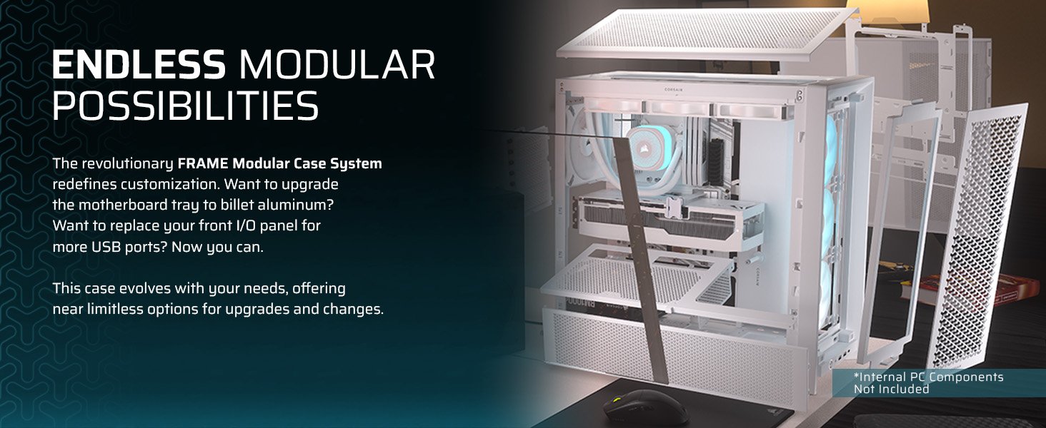 - FRAME Modular Case System – The revolutionary FRAME system gives new meaning to the word customisation. Want to upgrade the motherboard tray to billet aluminium? Want to swap out your front I/O panel for more USB ports? Now you can. A case that can change and grow with your needs (or just your mood). The options are nearly limitless