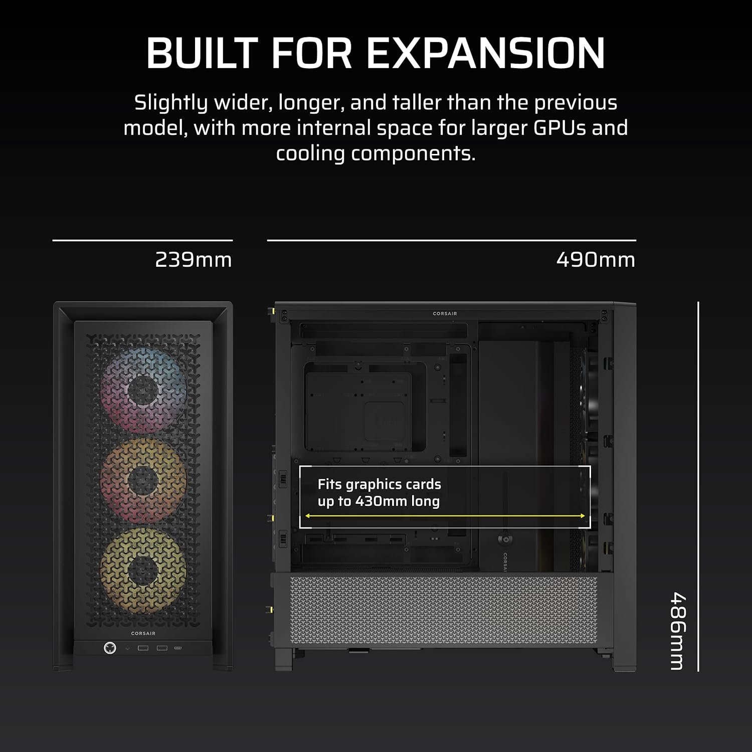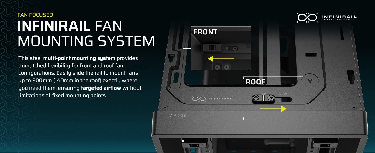 - CORSAIR InfiniRail Fan Mounting System – This steel multi-point mounting system offers unmatched flexibility in front and roof fan configuration. Simply slide the rail to mount fans up to 200mm (140mm in the roof) wherever you like, ensuring targeted airflow