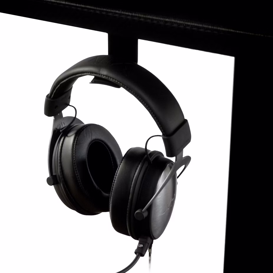The outer edge of the table top is slightly turned inwards. This provides the optimal angle for viewing monitors. A total of three rounded inlets - to the desk's right, left and in the middle - allow cables to be routed from the top down to the computer. A headset holder can be attached to the side, this is included in the package.