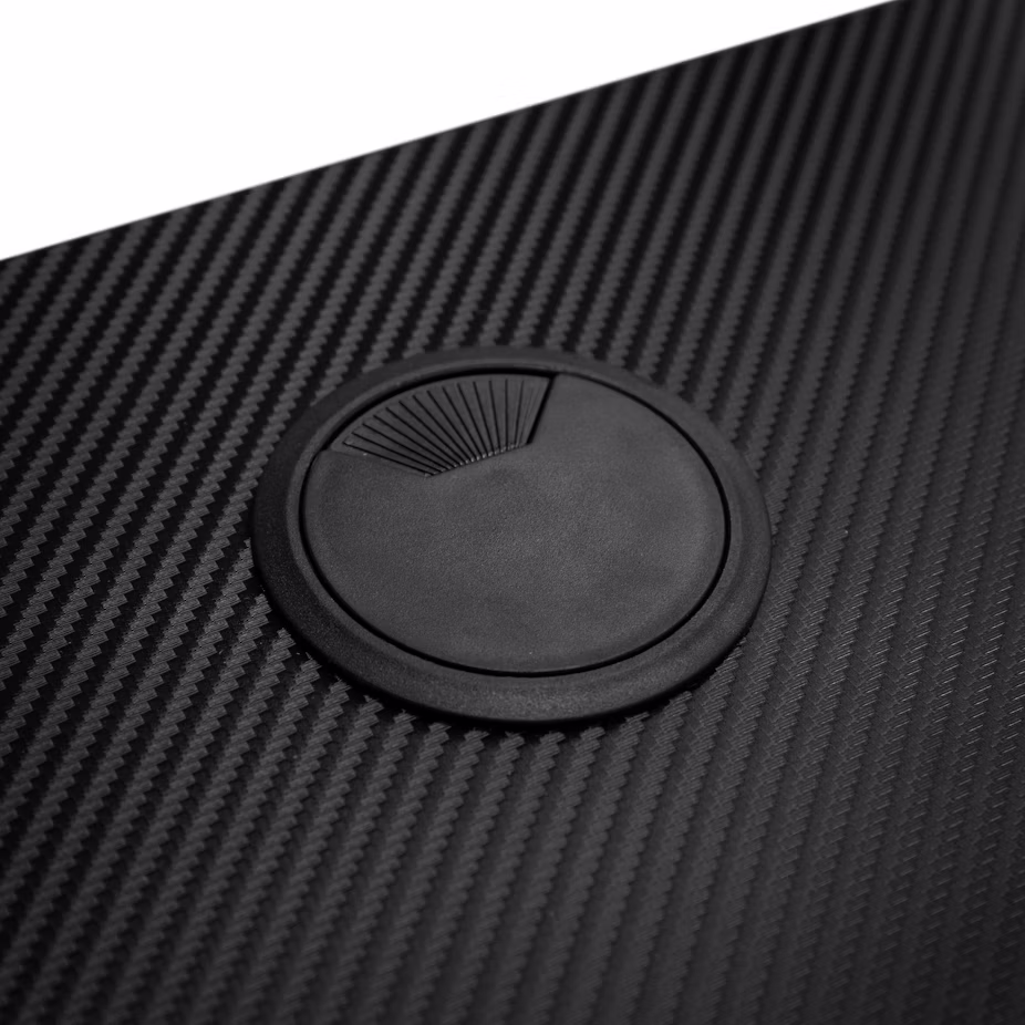 On a solid but chic steel base rests three 25mm thick plates made of a robust MDF with a fine grained plastic surface that evokes the look of and feel of fine fabric. The table top can be covered with a sleek black mat with a micro-woven Carbon Fibre effect surface that is designed for durability. Any mouse with common sensor types can be used on it, making a mouse pad only necessary for aesthetic reasons. Thanks to its huge dimensions of 160 centimetres in length and 80 centimetres in width there is enough room for up to three monitors in addition to the mouse and keyboard.